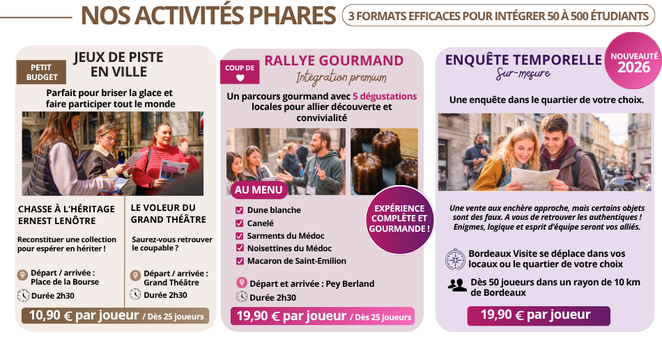 Répartis en équipes, vous devrez suivre les indices disséminés à travers la ville, résoudre des énigmes et relever divers défis qui testeront votre logique et votre sens de l’orientation. Ce défi vous fera explorer les rues historiques, les places cachées et les passages insolites de Bordeaux, tout en vous offrant une occasion unique d’apprendre à mieux connaître vos camarades dans une ambiance ludique et interactive.